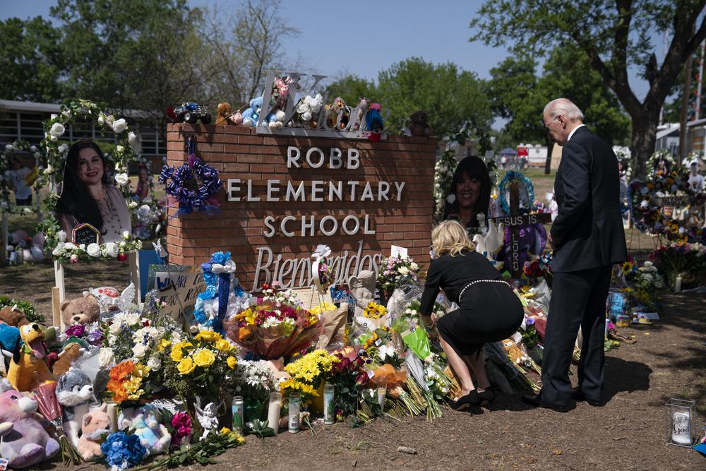 En la Escuela Primaria Robb, Biden se detuvo ante un monumento conmemorativo improvisado con 21 cruces blancas —una por cada víctima— y Jill Biden dejó un ramo de flores blancas frente al letrero de la escuela. Observaron cada uno de los 21 monumentos individuales, y la primera dama tocó las fotografías de los niños mientras la pareja recorría el homenaje.