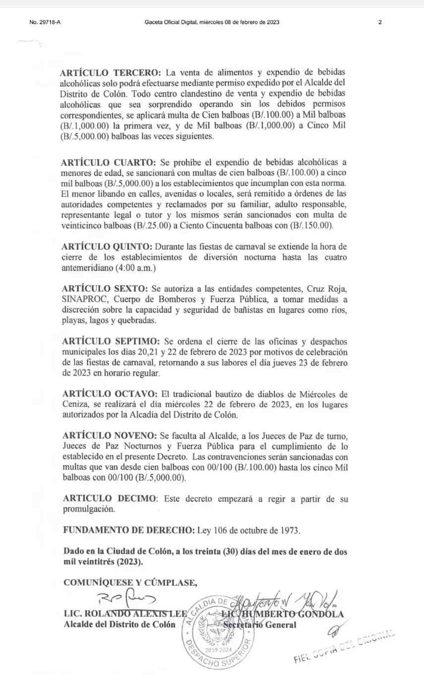 Además, el Decreto hace de conocimiento público que, todo menor de edad que sea sorprendido libando licor en las calles, avenidas o locales, será remitido a órdenes de las autoridades competentes y reclamados por un familiar o adulto responsables y sancionados con multa de 25.00 a 150.00 balboas.