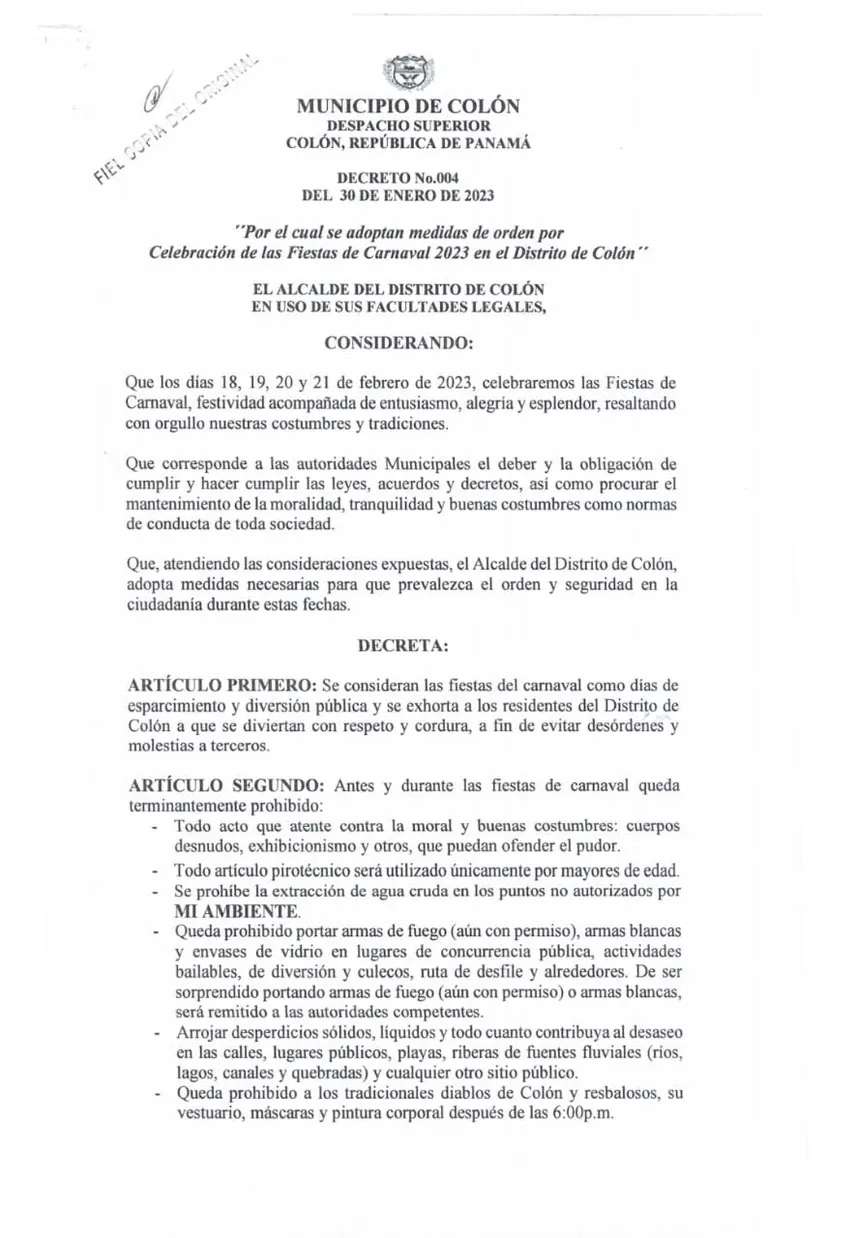 Por tanto, el Decreto No. 004 del 30 de enero del 2023, por el cual se adoptan medidas de orden por Celebración de las Fiestas de Carnaval en el Distrito de Colón, prohíbe las siguientes acciones y objetos: