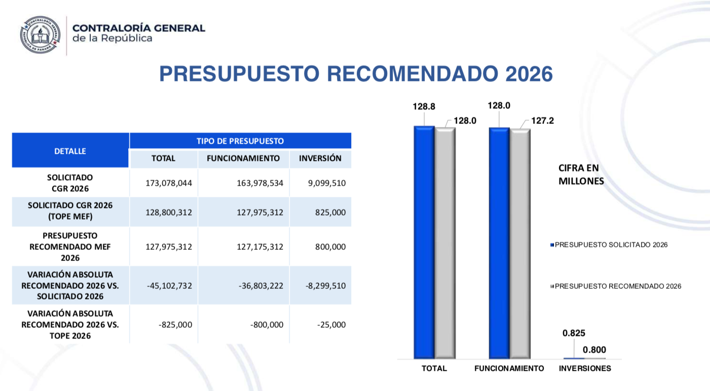 El contralor general de la República, Anel Flores, en compañía del secretario general, Ventura Vega, y su equipo de trabajo, sustentaron ante la Comisión de Presupuesto de la Asamblea Nacional el presupuesto para la vigencia fiscal 2026 por un monto de 128 millones de dólares. Este presupuesto contempla una partida para funcionamiento de 127.9 millones y otra para inversión de 800 mil dólares.