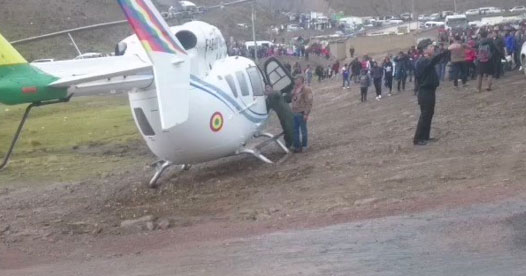 El suceso ocurrió a las 12.48 locales (16.48 GMT) e involucró a la aeronave EC-145 que iba a trasladar a Morales desde la localidad de Colquiri, en el departamento de La Paz, hacia la región vecina de Oruro, según un comunicado de la FAB.