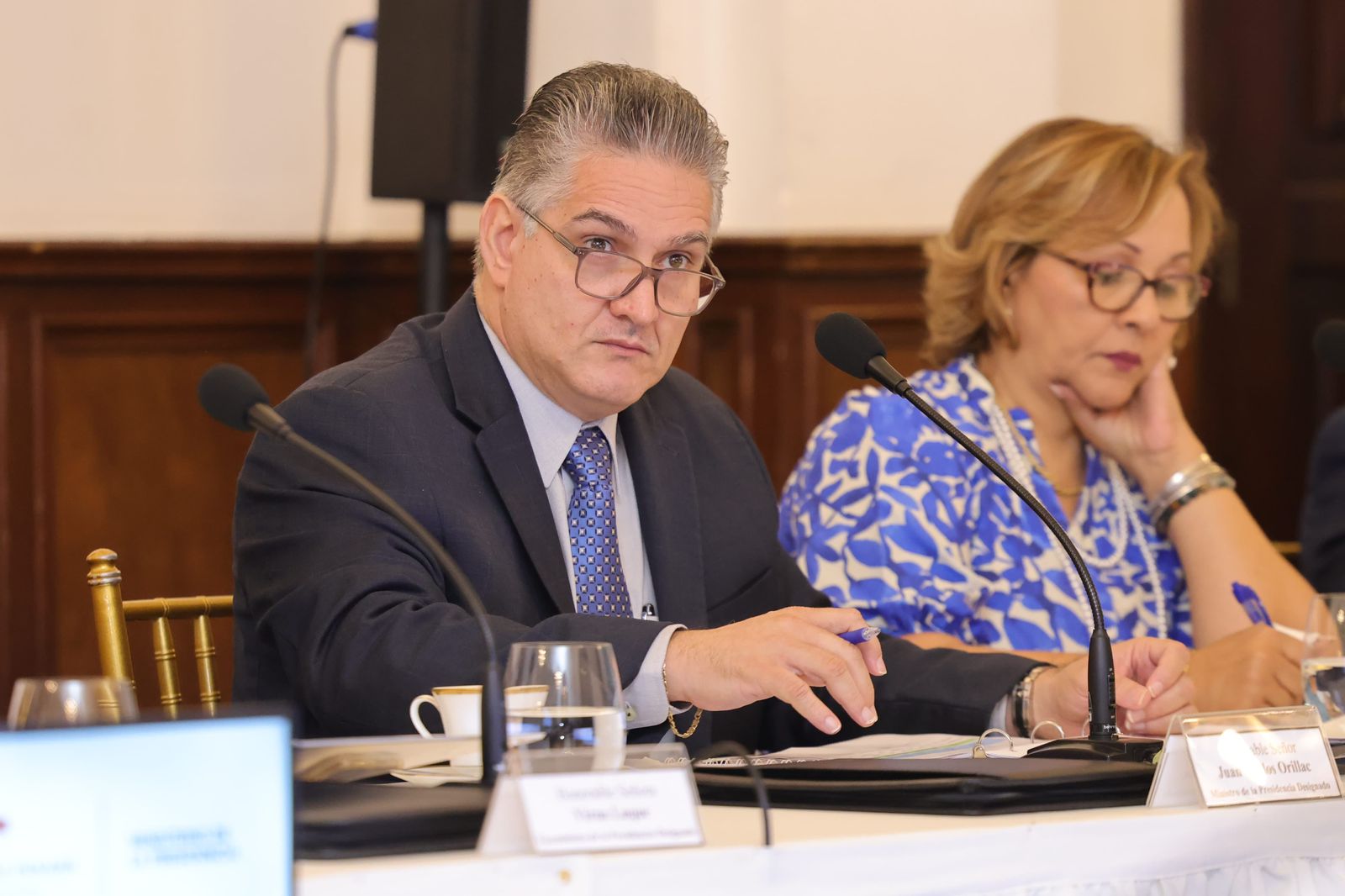 Panamá, 5 de junio de 2024. El ministro de la Presidencia, José Simpson Polo, y el ministro de la Presidencia designado, Juan Carlos Orillac, encabezaron esta mañana la tercera reunión de transición para el cambio de Gobierno ordenado, transparente y ejemplar entre la administración saliente, del presidente Laurentino Cortizo Cohen, y la entrante del presidente electo, José Raúl Mulino.