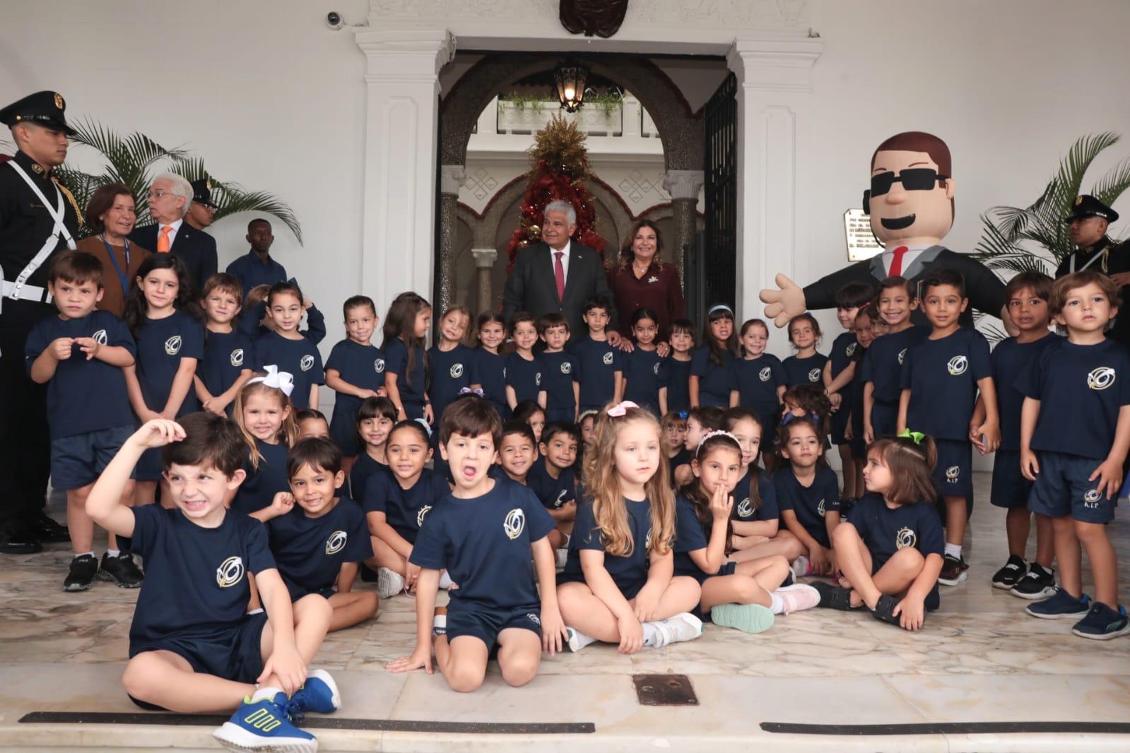 El presidente de la República, José Raúl Mulino, hizo hoy un alto en su agenda de trabajo para recibir, junto a su esposa, la primera dama, Maricel Cohen de Mulino, a un grupo de niños y niñas de prekínder y kínder de la Academia Interamericana de Panamá que visitaron el Palacio Presidencial.