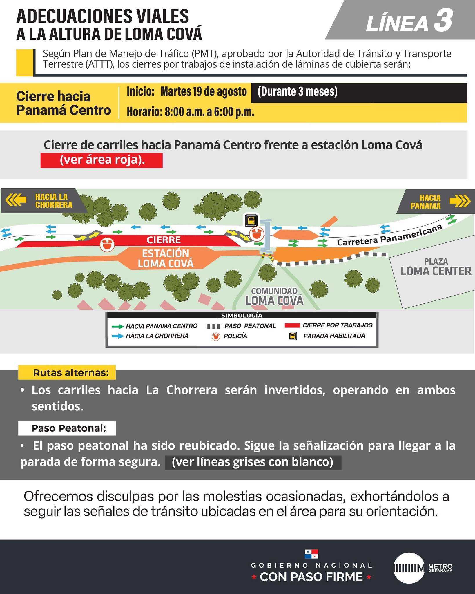 El Metro de Panamá informó que a partir de mañana, 19 de agosto, se realizará el cierre parcial de la carretera Panamericana, a la atura de Loma Cová, por trabajos de la Línea 3.