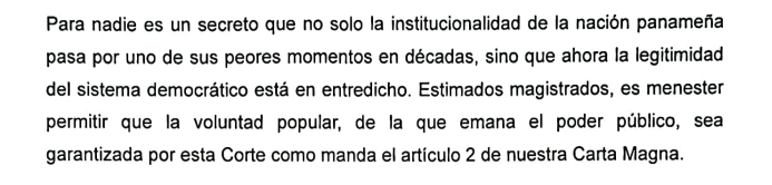 El jurista, mediante un escrito de 13 páginas, plante que no existe prohibición ni limitación que impida la elección de José Raúl Mulino siendo que el mismo cumple a cabalidad con todos los requisitos para, de ser electo, cumplir cabalmente su función presidencial sin mayor obstáculo. Allí se hace eco de una publicación del exmagistrado de la Corte Suprema de Justicia, Edgardo Molino Mola.