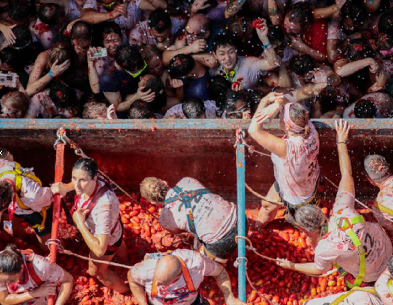 A la hora pautada ha sonado la carcasa pirotécnica que ha dado inicio al lento desfile de seis camiones cargados con miles de tomates de la variedad pera tienen más jugo-, no aptos para el consumo pero ideales para usarlos como munición en una batalla campal que se esperaba con impaciencia.